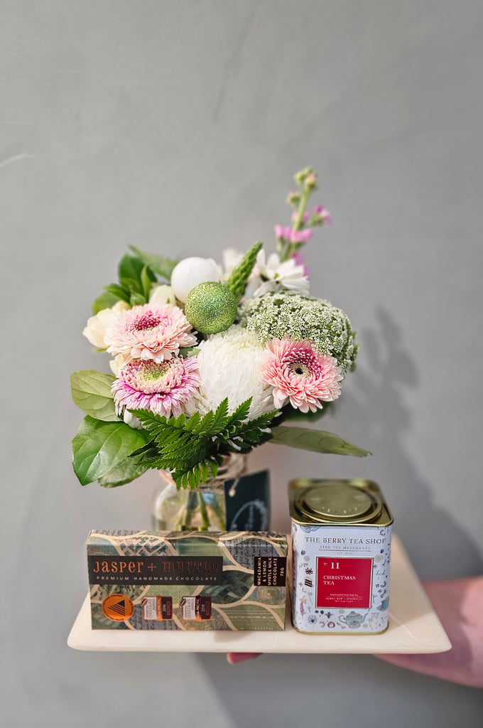 This gift bag includes a cute festive mason jar posy of seasonal blooms, a lovely tin of aromatic tea from The Berry Tea Shop and a block of delicious chocolate from Canberra's artisan chocolate makers, Jasper & Myrtle.